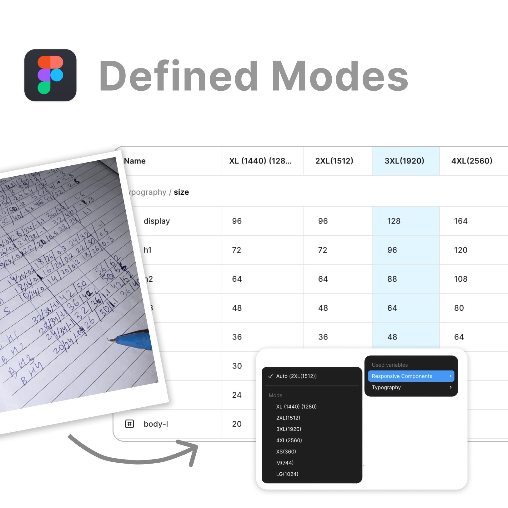Figma Variable Modes. Two layout states — Standard (1440px) and Wide (2560px). Spacing, max-widths, column counts all set as variables. Switch the mode — entire platform adapts. One source of truth.